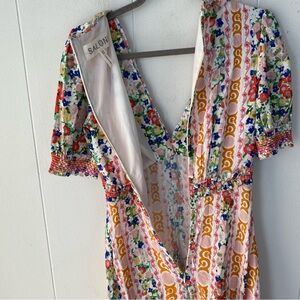 Saloni Lea Smocked Floral Print Crepe Mini Dress Sz. 2 White Orange Pink V Neck