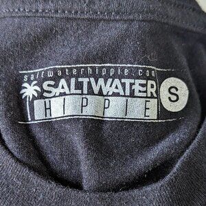 This lightweight black tee features a bold "Saltwater Hippie" graphic on both the front and the back of the garment. Shirt is lightly stretchy.