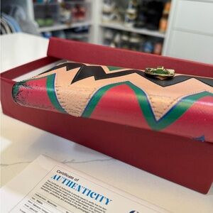 Elevate your style with this chic multicolor chevron wallet / clutch I’m including a chain to use as clutch as welll. Full inclusion with box and COA. Good condition with signal of use on creasing side.