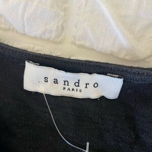 This chic black blouse from Sandro features a sleeveless design with a notched collar and elegant ruffled details. The buttoned front adds a touch of sophistication, making it a versatile piece for both casual and formal occasions. Its classic style and solid color make it a timeless addition to any wardrobe.