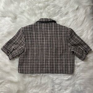 Sandro Glwadys cropped metallic cotton-blend tweed jacket. Go for a modern desk-to-dinner vibe in this cropped short-sleeve jacket covered in plaid-pattern tweed.