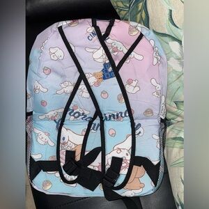 Adorable Sanrio Cinnamoroll backpack for kids. Features a playful blue and pink design with cute Cinnamoroll graphics. Perfect for school or travel.