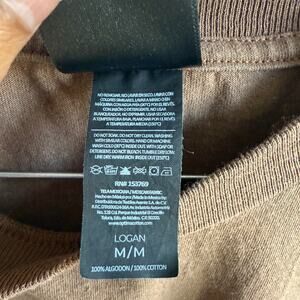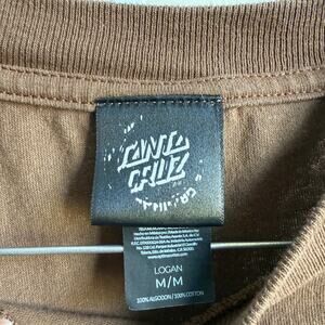 This is a pre-owned Santa Cruz T-shirt, size M/M. The shirt is brown and features a white "Santa Cruz" logo on the front. It has a crew neck and short sleeves. The material is 100% cotton. The shirt is in good condition with no visible stains, tears, or holes. There are some minor signs of wear, such as slight fading.