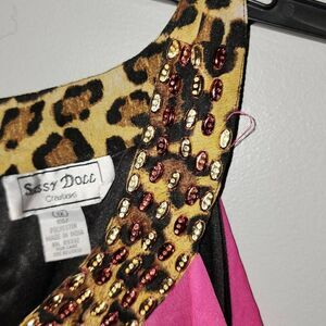 Pink with animal print maxi sheath style dress. Beading on collar. SEE PHOTO MISSING 2 BEADS.  KEYHOLE BACK OVER THE HEAD NO ZIPPERS