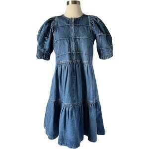 Keywords: puff sleeve dress, denim mini, Sea New York, casual chic, quiet statement, 100% cotton, everyday dress, transitional layers, paneled construction, soft denim, minimalist, indie fashion, street style, tiered silhouette, artisan feel, summer to fall style