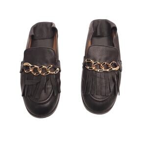 Mahe leather loafer in goatskin with a tunit rubber sole. The See By Chloé-engraved enamel chain and fringed detail bring a dandy appeal while the fold-down heel ensures a laid-back attitude.