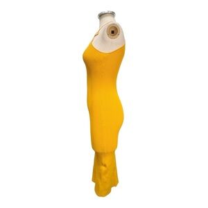 Features: Viscose blend stretch ribbed knit fabric in yellow. Halter style neckline with lace detail on the front and back. Sleeveless. Midi. Pull over.