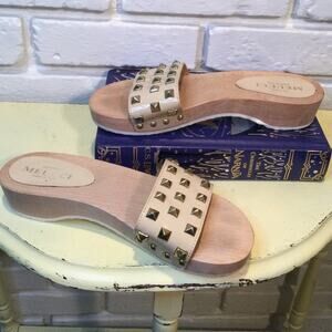 Condition is good pre-owned. Very little wear. Wooden base sandals similar to Dr. Scholls. Light tan patent leather top with brass studs. Tagged size 38. 1 lb 3 oz