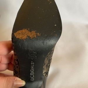 Sexy BCB Girls Open Toe Heels in Black and Gray!  There is some damage to the right heel and the bottom of both shoes. Please see all pictures for condition. BCB Girls Logo repeated all over the shoe. So beautiful!