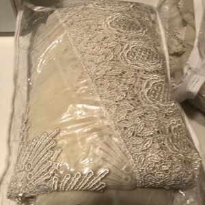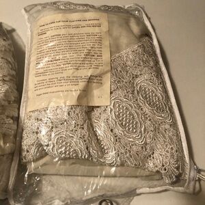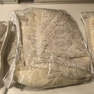 Never used beautiful sheers Curtains with Amazing design. The laces are gorgeous it’s for 3 big windows and one small window the shapes are like triangle cut. The small one is 35X39 inches and the big one each piece are 46x62 inches I paid a lot for it the color is cream the laces are off white color each window have two pieces