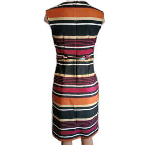 Elevate your style with this chic striped dress. Featuring a vibrant mix of orange, pink, and black, this dress is perfect for any occasion. The belted waist adds a flattering touch. Dress is size 8.