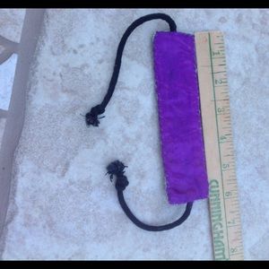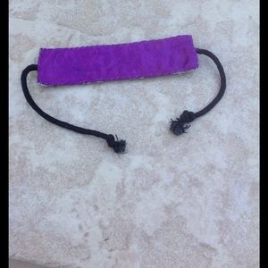 Pretty shell bracelet with blue, white and teal beads. Tie closure. Purple satin backing. Approx 6"