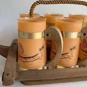 Siesta Ware Vintage Peach Glasses Set of 6 With Canoe Outrigger Carrier Wooden T