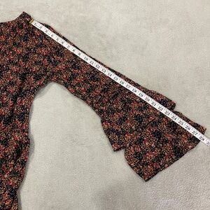 Silk floral print dress with ruffle detail on the sleeves, with buttons down the front and a slightly cinched waist.
