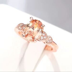 Elevate your style with this stunning rose gold tone ring, featuring a pear-shaped simulated morganite stone surrounded by clear cubic zirconia. The ring is made of copper and is a size 8. The gorgeous champagne color of the main stone and the intricate design of the ring make it a perfect addition to any jewelry collection.