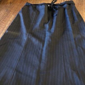 Classic J.Crew Black Pinstripe A-Line Skirt with Tie Waist. This sophisticated skirt from J.Crew features a timeless black fabric with subtle blue pinstripes. It has a flattering A-line silhouette, a comfortable flat front, and a thin tie belt at the waist for adjustable styling. Made from a blend of 99% wool, it's perfect for a polished and professional look.
