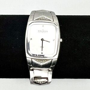 Beautiful Year 2010 Working, new battery installed, Skagen Denmark Rectangular Silver Watch Model SK811SSX featuring: