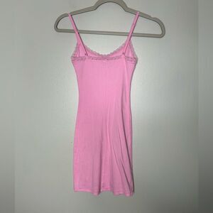 Size XXS. Small roses at each strap. This elegant pink slip dress offers a comfortable and stylish fit, perfect for lounging or layering. Enjoy the soft fabric and flattering design.