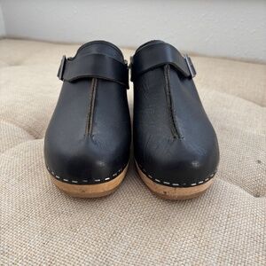 Skola Organic Comfort Footwear Clogs. Handmade in Sweden. Black vegetable tanned leather upper, tan wooden soles. Moderate heel height. Strap detail with silver buckle can be worn around the heel or be pushed up to the upper part of the clog. Seam detail down the top of the clog upper. Slight signs of wear; otherwise, in great condition and ready for the cooler months.