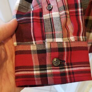New with partial price tag, Men's Slate & Stone Plaid long sleeve button up shirt, size Small. Color is Red, black, taupe and off white. Regular fit.