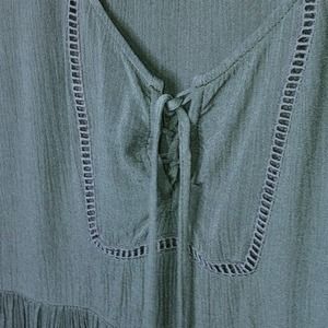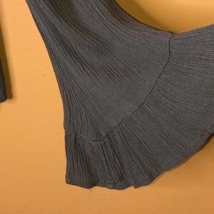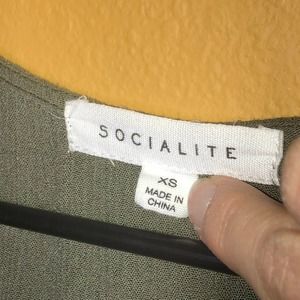 Socialite army green/olive boho blouse. Lace up tie at the neck. Bell sleeves. Loose fit bottom. Crinkle material. 100% rayon. In great condition. Size XS. No holds or trades