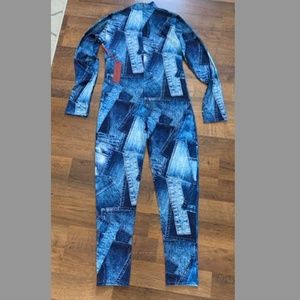 Looks like it's patchwork acid wash denim but it's soft like butter cotton! So comfy! Plus, this print has been used by countless high-end designers and in my closet I have an example of a similar print from Stella McCartney and the tights were over $150. It's a little bit throwback mixed with an updated twist. SO FUN!!