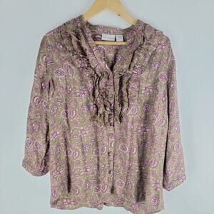 Soft Surroundings Floral Ruffle Button Up Blouse Long Sleeve Size L