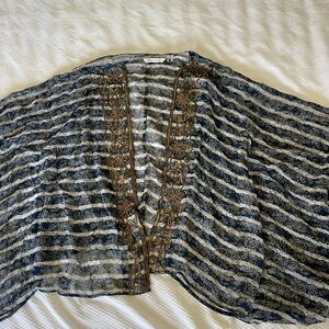 Elegant poncho with navy and tan stripes. Features delicate embroidery. Ideal for layering.