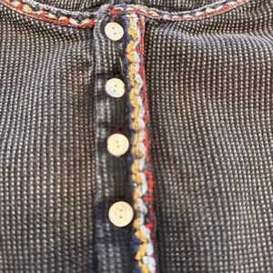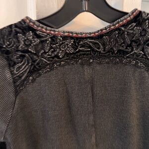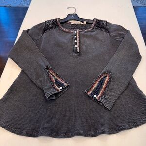 Excellent condition. Women’s soft surroundings long sleeve black wash top. Long sleeves with embroidered and ruffled cuffs, 4 button round neck, embroidered trim & 100% cotton. Size Small Petite. See photos for measurements