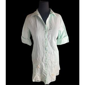 A beautiful soft surroundings sea foam green / blue seashell button up rolled cuff collared dress.