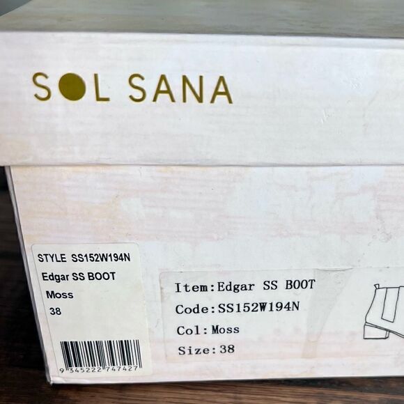Sol Sana Edgar SS Boot in Moss Green with Black Stretch Sides and Silver Accents at the toe. Size Euro 38/US 7, see size chart in pictures. Includes dust bags for shoes. Brand new in the box, never worn.