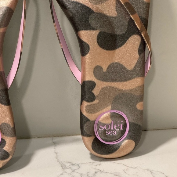 Stylish camo flip flops featuring a pink strap. Perfect for casual wear. Brand new never worn. NWOB. Super comfy!