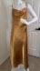 Stunning Sophia by Delicates gold satin gown with a sleek silhouette. Perfect for formal occasions.