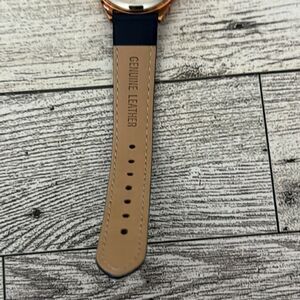 Sophie & Freda Navy Blue Leather Band Ladies Watch New In Box.  Never used, still has film on watch face and back.  Needs battery.  Watch face measures 1.25” diameter.