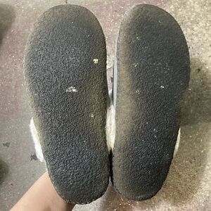 Cozy Sorel slippers with a soft suede exterior. Features a plush white fur trim for added warmth.