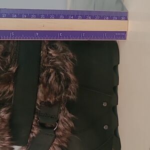 Waterproof leather and suede in deep dark gray with faux fur in mixed brown tones.