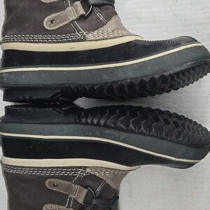 Experience warmth and style with Sorel's gray winter and rain boots, featuring a waterproof design and durable rubber sole for excellent traction. The tall shaft with faux fur trim and insulated interior ensures comfort in cold weather, while the lace-up closure provides a secure fit. Good condition see pics