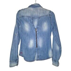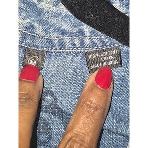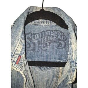 The Southern Thread Pearl Snap Western Zip Up Back Long Sleeve Roll Tab Shirt in size medium is a stylish and versatile top for women. Made from 100% cotton denim in a solid blue color, this collared shirt features pearl snaps, a zipper closure, and roll tab sleeves for a trendy cowgirl look. Perfect for casual outings, parties, or travel, this slim-fit shirt also includes accent details like a branded logo and pockets for added style and functionality. Ideal for all seasons, this button-up shirt is a must-have for anyone who loves the Western theme.