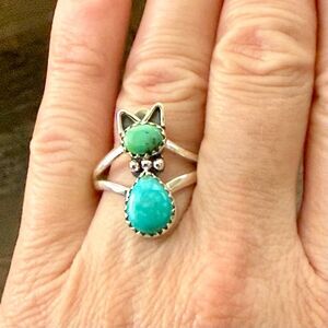 Southwest Kingman Turquoise Cat Ring Artisan Handmade Sterling Silver Size 7