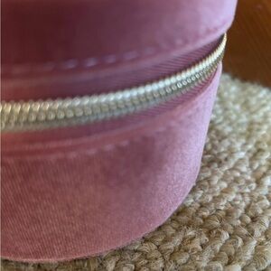 Store your treasures in this elegant pink velvet jewelry box. Its luxurious design adds a touch of sophistication to any dresser. Perfect for keeping your accessories organized and secure. Like new condition! Please see pics for measurements.