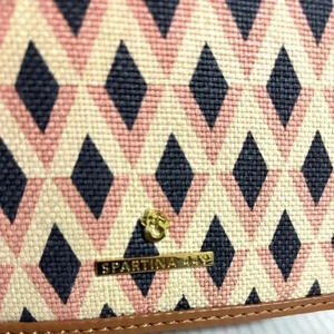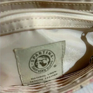 Spartina 449 canvas crossbody handbag with leather strap & trim with gold tone hardware main compartment 2 pockets at interior wall 1 zip closure 8 cards slots fabric lining logo at front & side snap pocket at back hight 4.5” width 9” depth 2” strap drop 23 adjustable The dimensions are based on approximately measurements before placing an order please check take a moment to view all photos using feature for a closer look