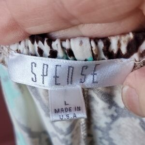 Stylish wide leg pants by Spense. Features a bold snake print. Aqua and brown colors. Perfect for a chic look.