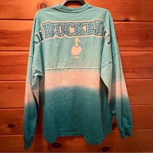Stylish long sleeve tee with a teal and white ombre design. Comfortable and casual. Perfect for everyday wear.