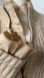 Elegant St. John knit cardigan jacket featuring a unique ribbed texture, a full zip closure, and a sophisticated beige and gold color palette. The jacket showcases distinctive design elements, including a stand-up collar, ruffled trim at the cuffs, and functional pockets seamlessly integrated into the ribbed pattern. The luxurious knit provides both warmth and a refined aesthetic, making it a versatile addition to any wardrobe.