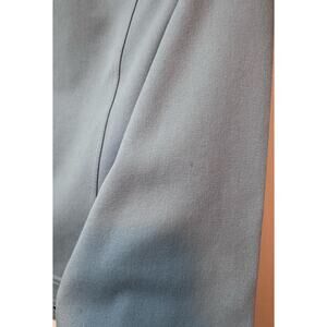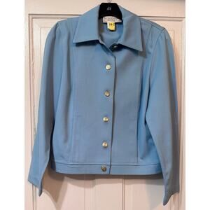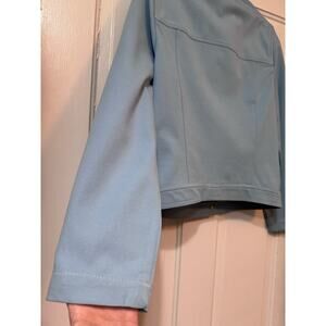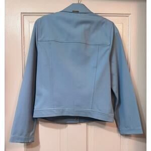 St. John Sport Blue Blazer Jacket. Size P (small). Pre-owned. Ptp measures 18.5 inches across. Jacket length from shoulder to hem measures 21.5 inches long. Jacket does have light stretch to it. Color is a light but vibrant baby blue. Has recently been professionally dry cleaned. Please note one tiny spot on sleeve shown in photos. Approximately pen tip sized. Overall very well cared for with light use. (#244A)