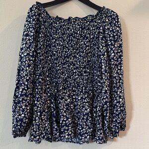 Elegant navy blouse with white floral pattern. Features smocked bodice and long sleeves. Perfect for versatile styling.