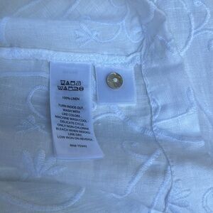 St. Tropez white linen embroider split neckline tuxedo pleated tunic. 3 button loop closures at center front. New. Small. Armpit to armpit approximately 20 inches. Shoulder to hem approximately 29 inches. Works great as swimsuit coverup also!