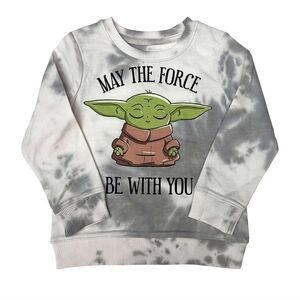 Gray sweatshirt has an all-over tie dye wash with a Grogu screen-print