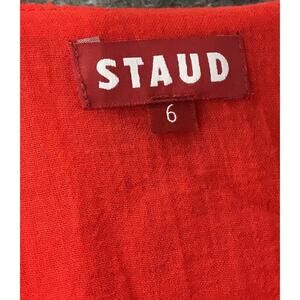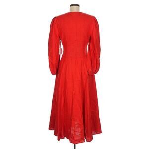 Staud Birdie Midi D Dress Red Linen Puff Sleeve Full Skirt bodice Button Front 6