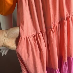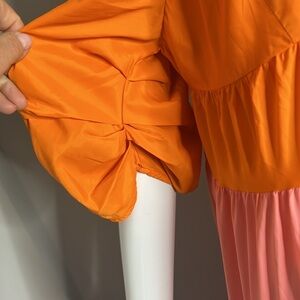 This is a beautiful Colorblocked and full of flattering volume, this groovy A-line maxi from Staud features a sexy plunge neckline framed by trend-right puff sleeves. Pink and orange colorblocked nylon (100% Recycled nylon). Maxi. Puffer sleeves. Deep V-neckline. Hidden back zipper closure. Imported. No odors. No stains. Hidden pockets